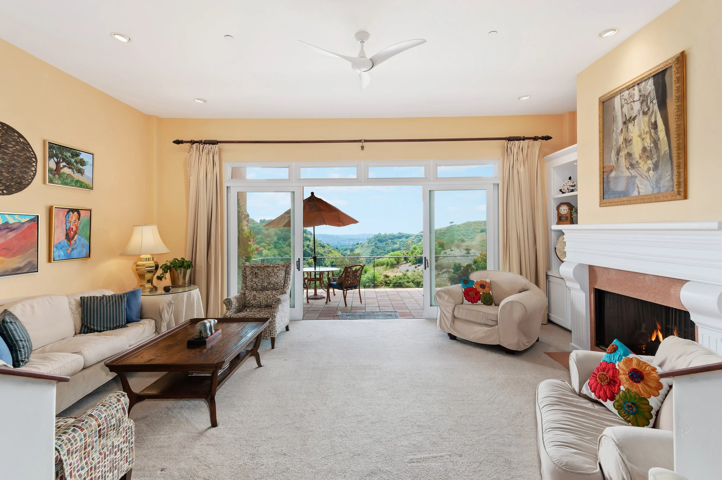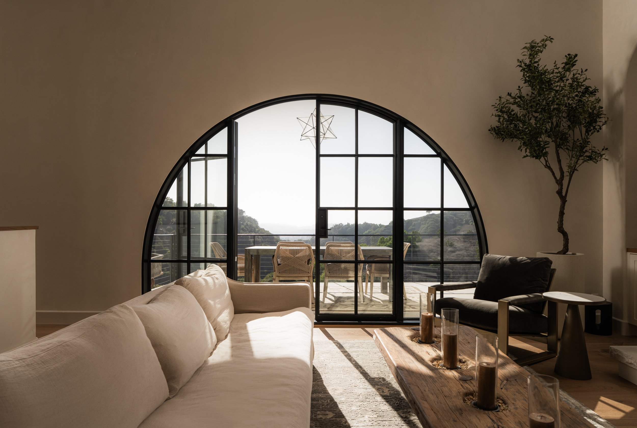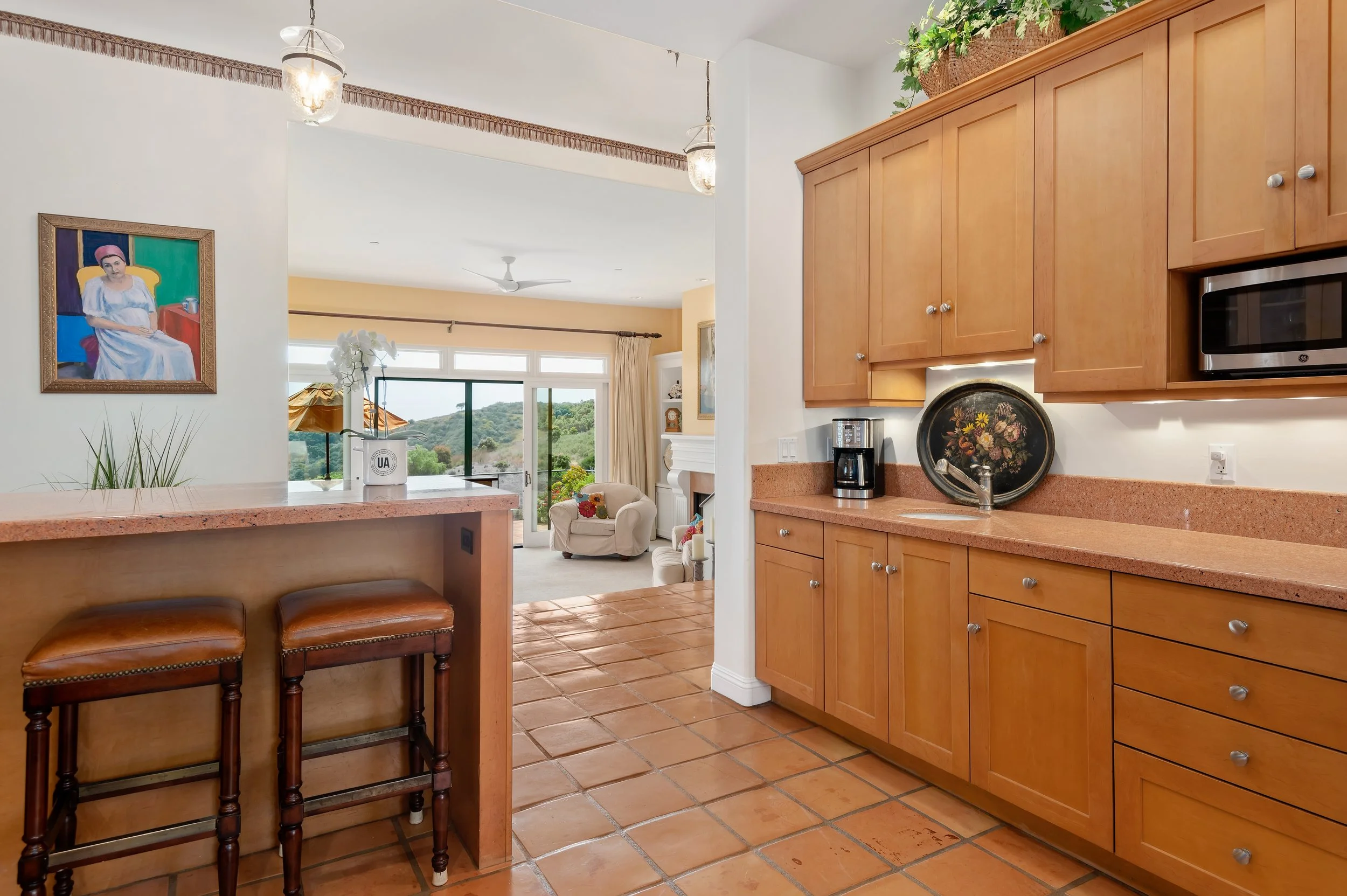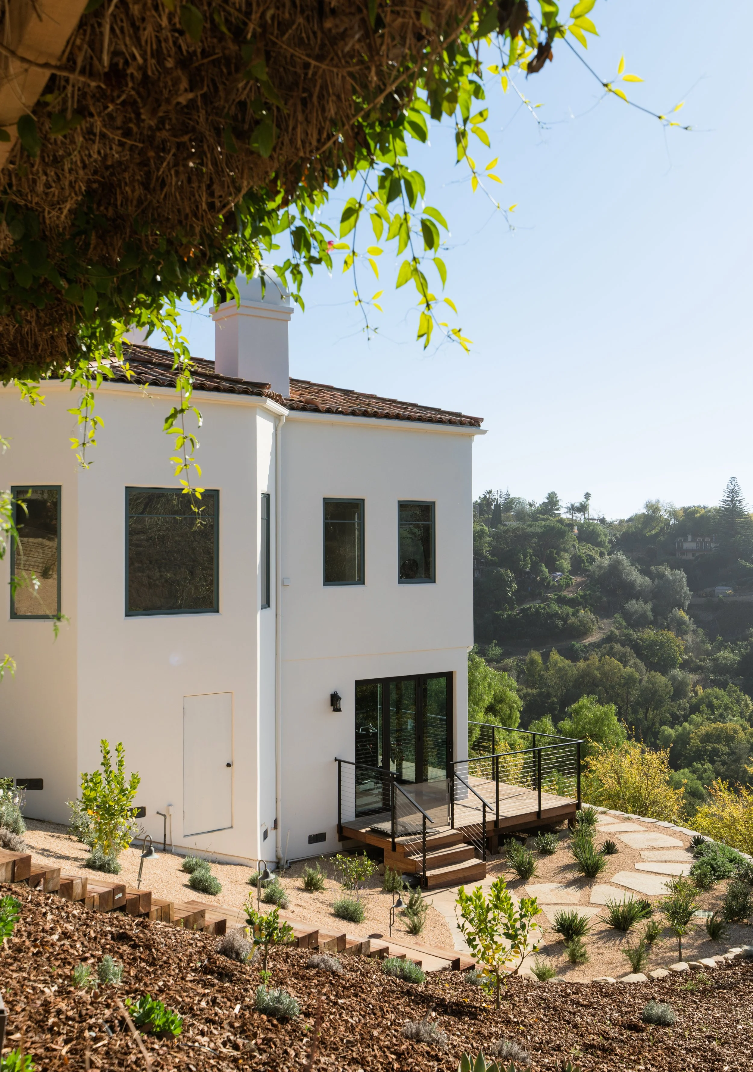 Perched atop a private knoll in Mission Canyon, this Spanish-style home was thoughtfully redesigned by our team to elevate its natural light, flow, and sweeping canyon views. Our updates refined the main living spaces, refreshed the chef’s kitchen, and enhanced the seamless indoor–outdoor connection that defines California living. Three en-suite bedrooms anchor the main level, with a versatile lower level offering space for guests, work, or wellness. Exterior improvements celebrate the property’s 4.6 acres, from view-filled terraces to beautifully restored pathways and garden moments. The result is a warm, sophisticated retreat that feels both grounded in nature and perfect for modern life.